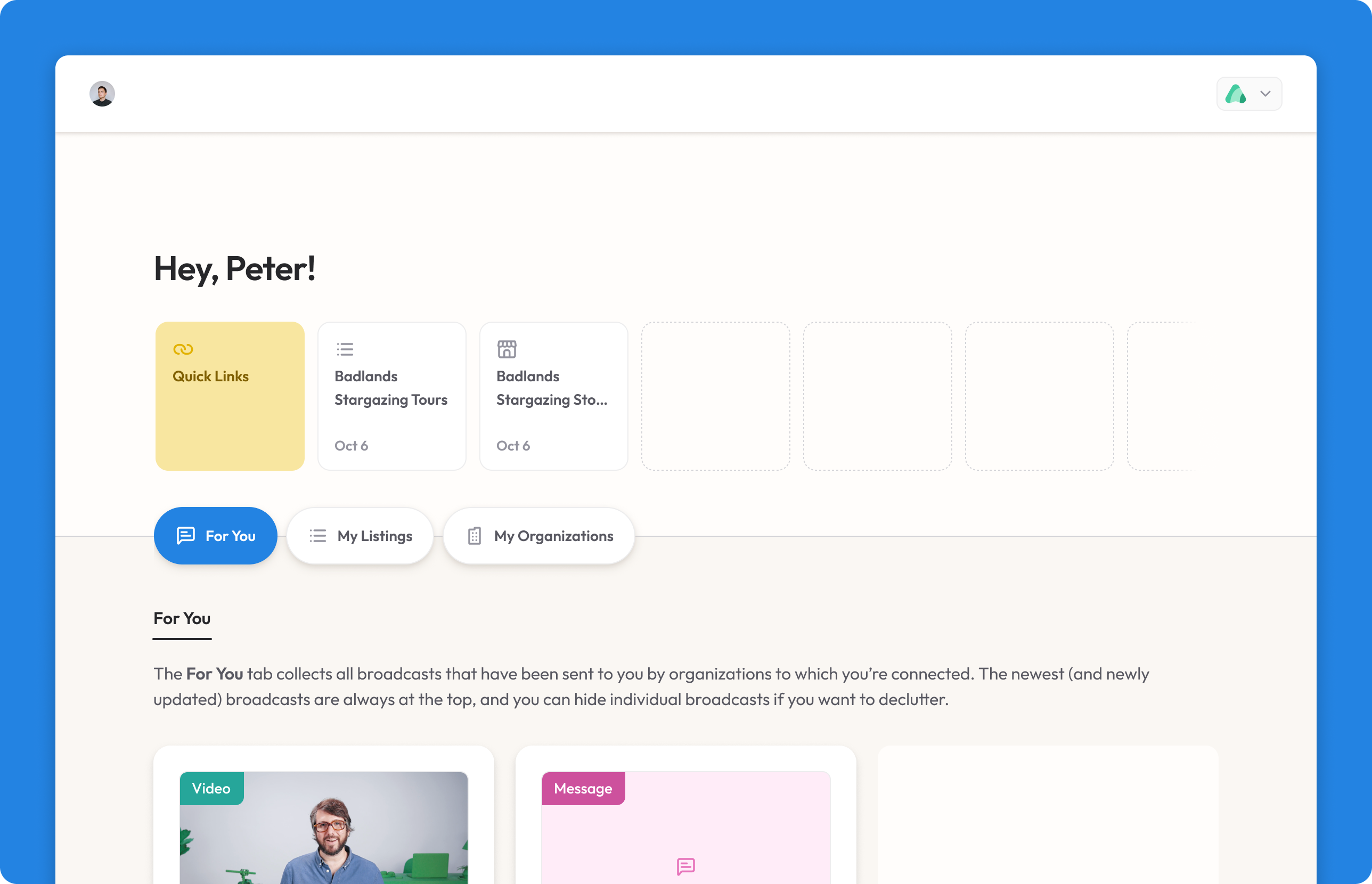The For You space collects all of the Broadcasts that have been shared with you by the tourism organizations you're connected to. Broadcasts might contain anything and everything from messages, video links, PDFs, courses, and more.
