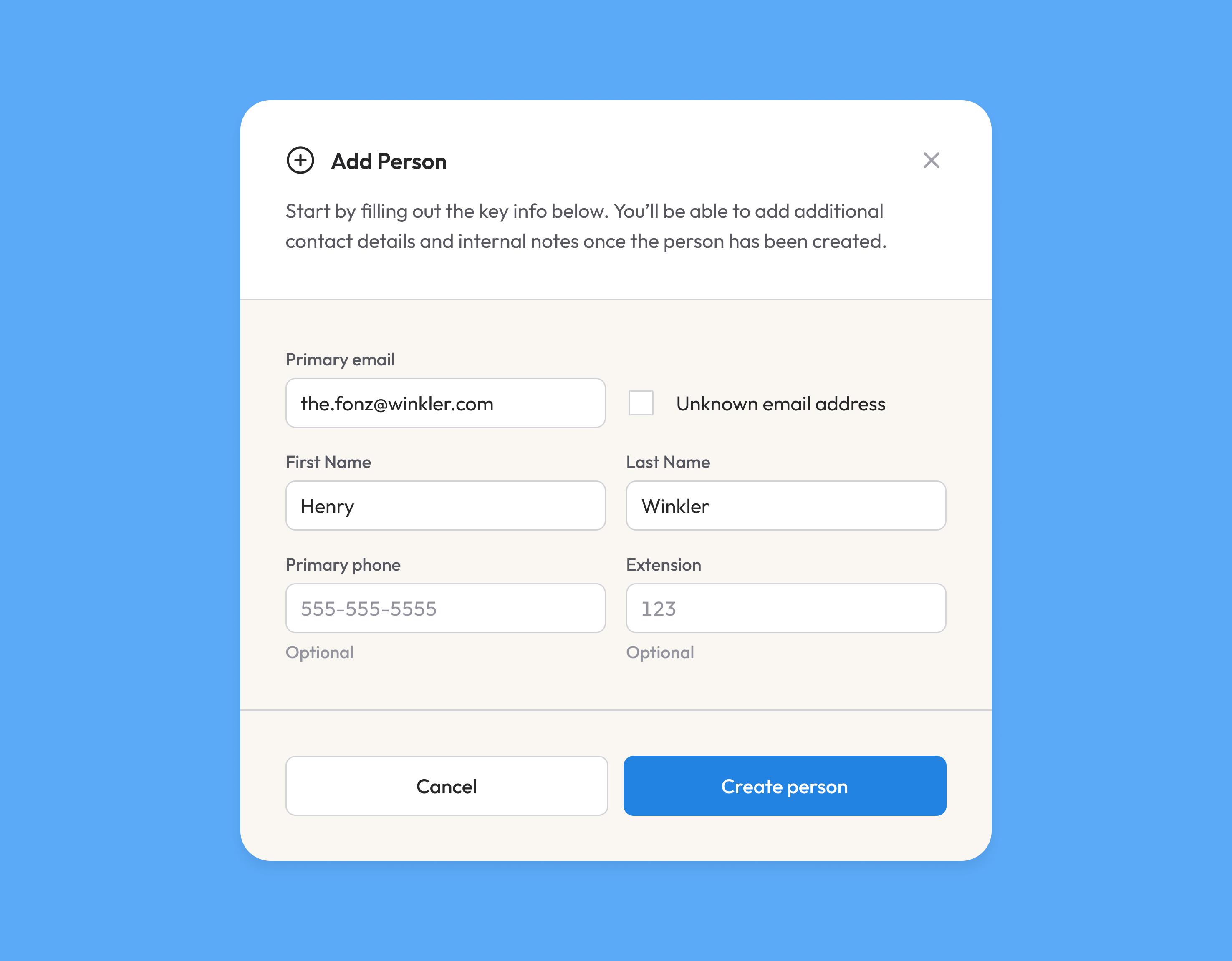If you have an email for this person, enter it first; we'll run a check to see if that person already has an existing profile in Whereabouts and, if yes, automatically pull in the remainder of their info. If you don't have an email, simply check the "Unknown email address" option and then manually enter the person's info.