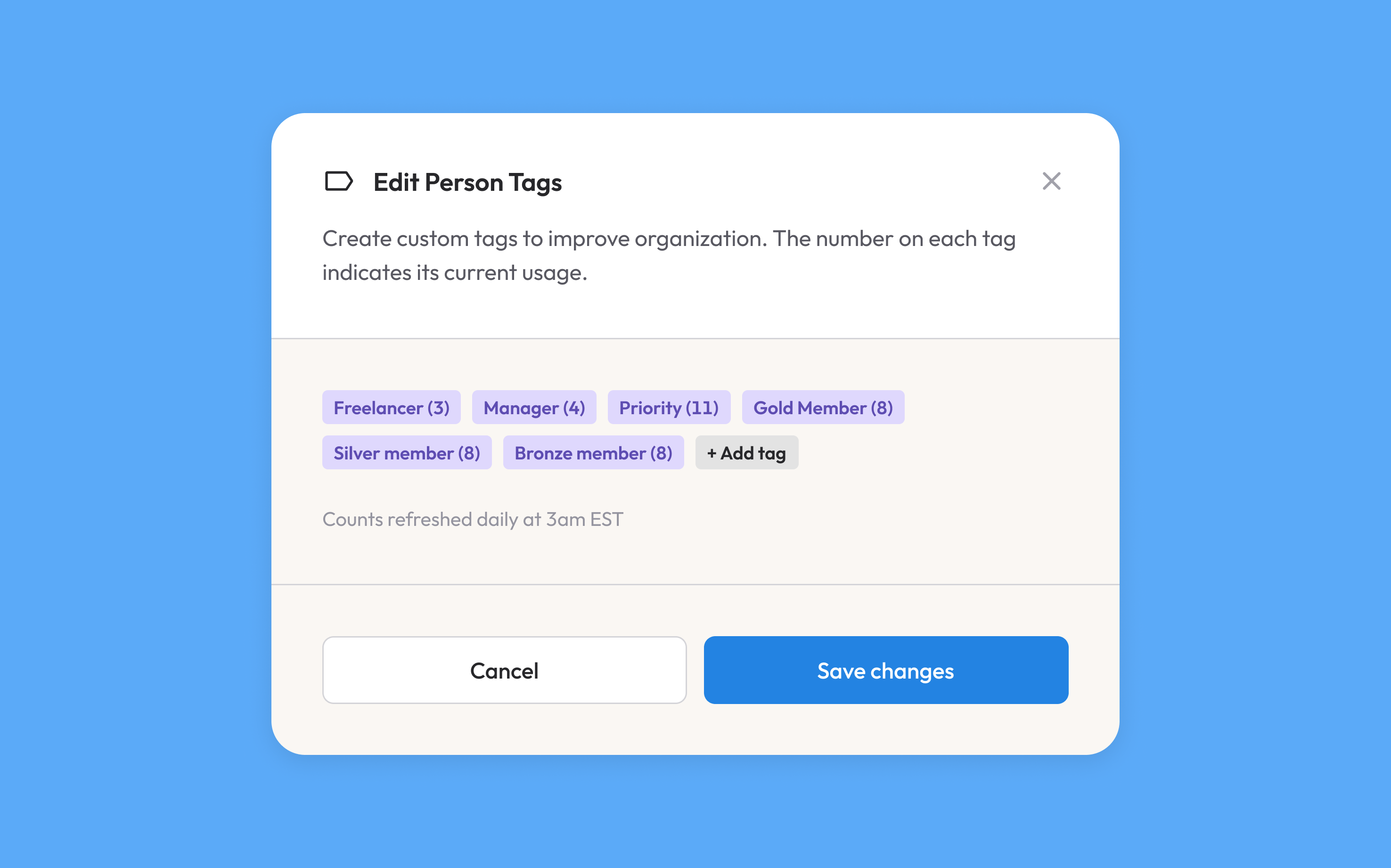 In the Edit Person Tags modal, you'll see the full list of your current custom tags and, at the end of the list, a button to create a new one. On each tag is displayed its total usage count.
