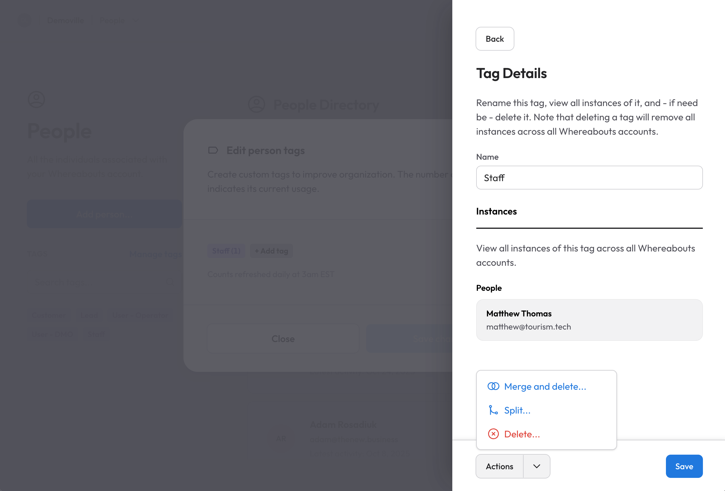 Clicking the Actions button at the bottom of the panel reveals a few additional options for the tag. From here, you can: