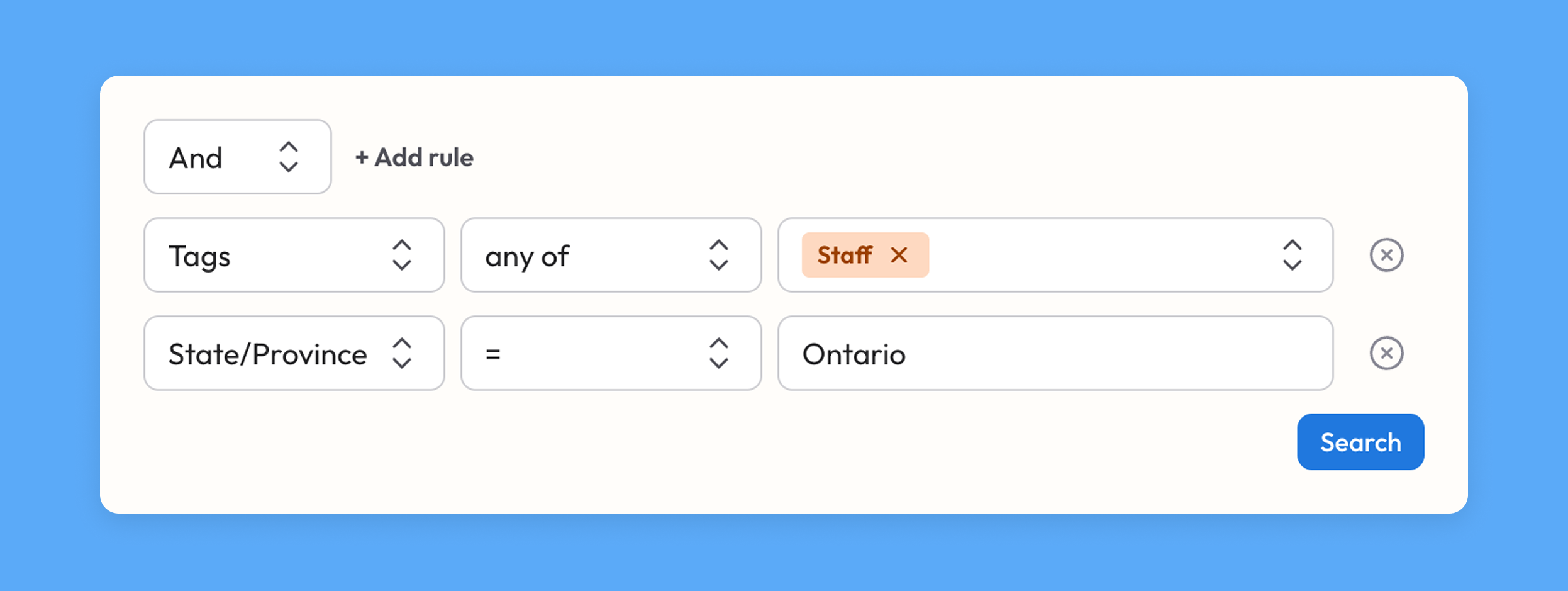 So, for example, if I wanted to find people who have a specific custom tag applied and are based in Ontario, my filter would look like this: