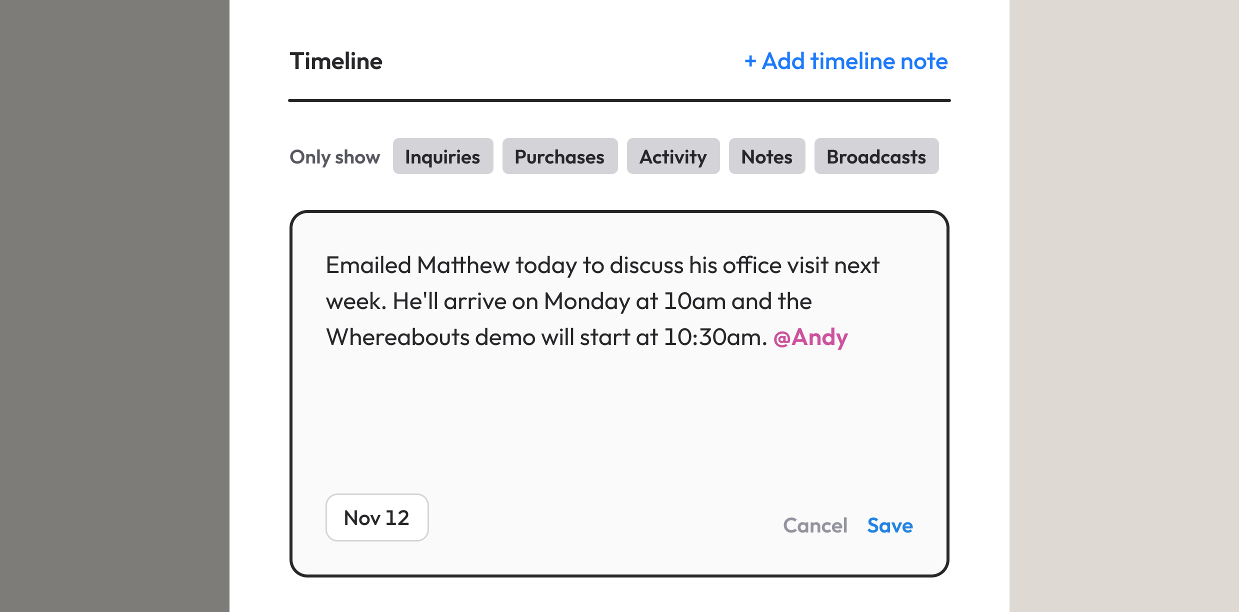 In the timeline, we display the person's activity across your Whereabouts account. Filters are available (e.g. Activity , Purchases , etc.) to see a specific type of timeline event. You can also add time-stamped notes to the person's timeline.