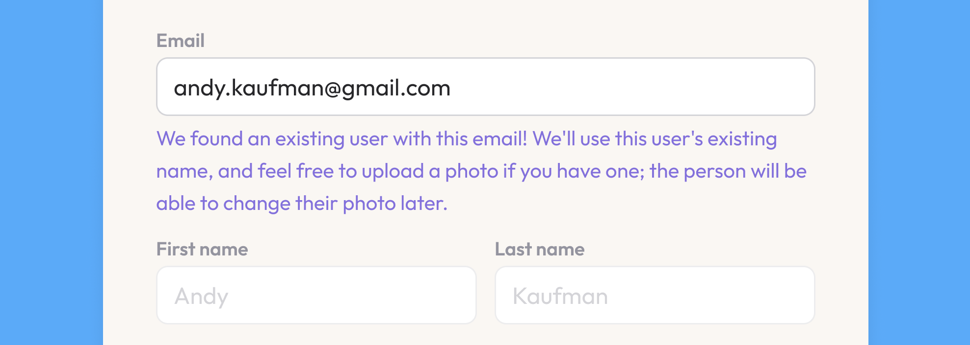 When adding an owner, editor, or viewer, an email address is required. Add the person's email and press enter ; we'll search through our database to see if a record for this person already exists. If yes, we'll automatically fill in their first and last name along with their profile photo (if they've already uploaded one).