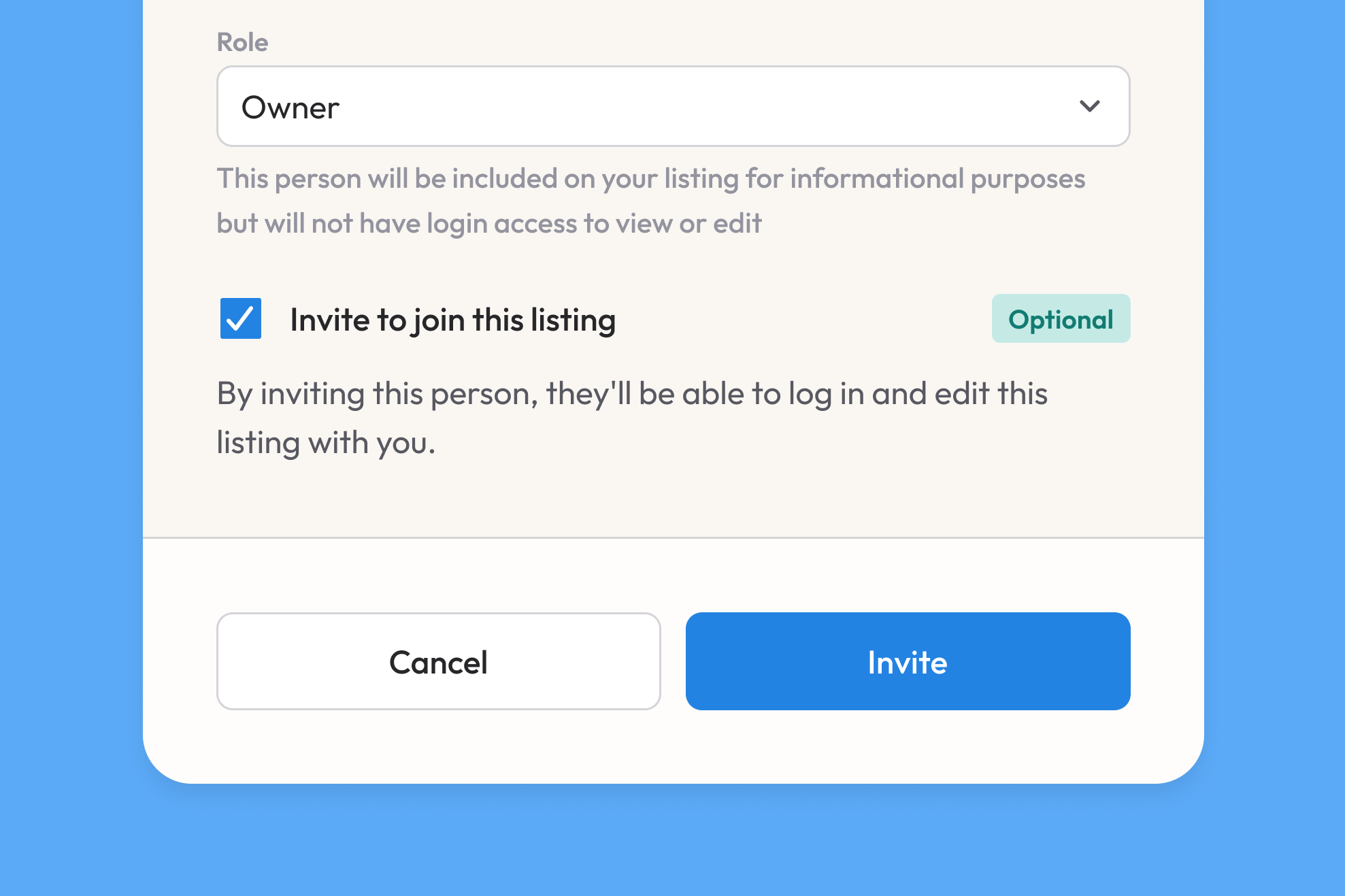 When adding a person to a listing and assigning them an access role, you can choose to send them an invitation immediately or at any later point.