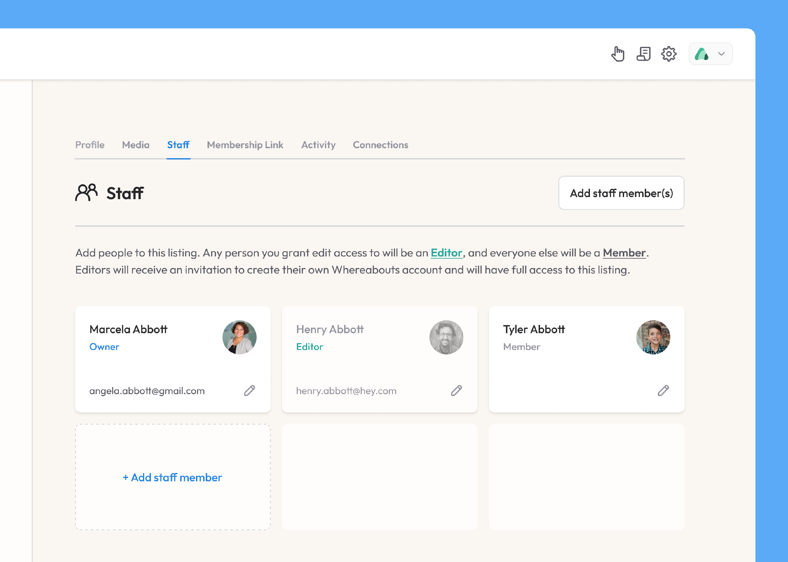 Each business listing in Whereabouts can have any number of staff members associated with it, and each can have a specific role; we'll go through the details of those roles in more detail below.