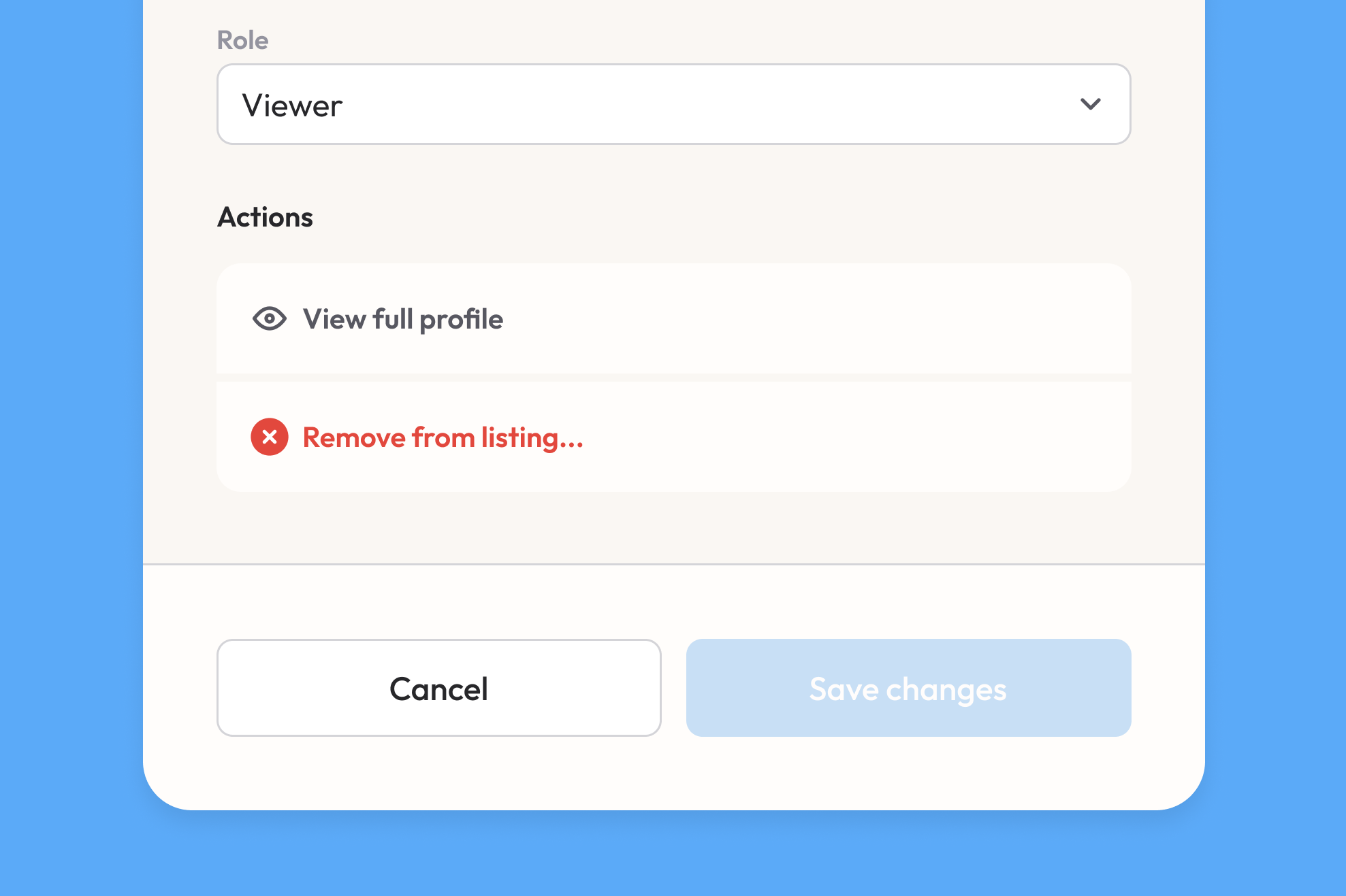 After a person has been added to a listing, you can always click on the edit icon on their staff card to re-open their modal. Now, at the bottom of the modal, you'll find an Actions section from which you can: